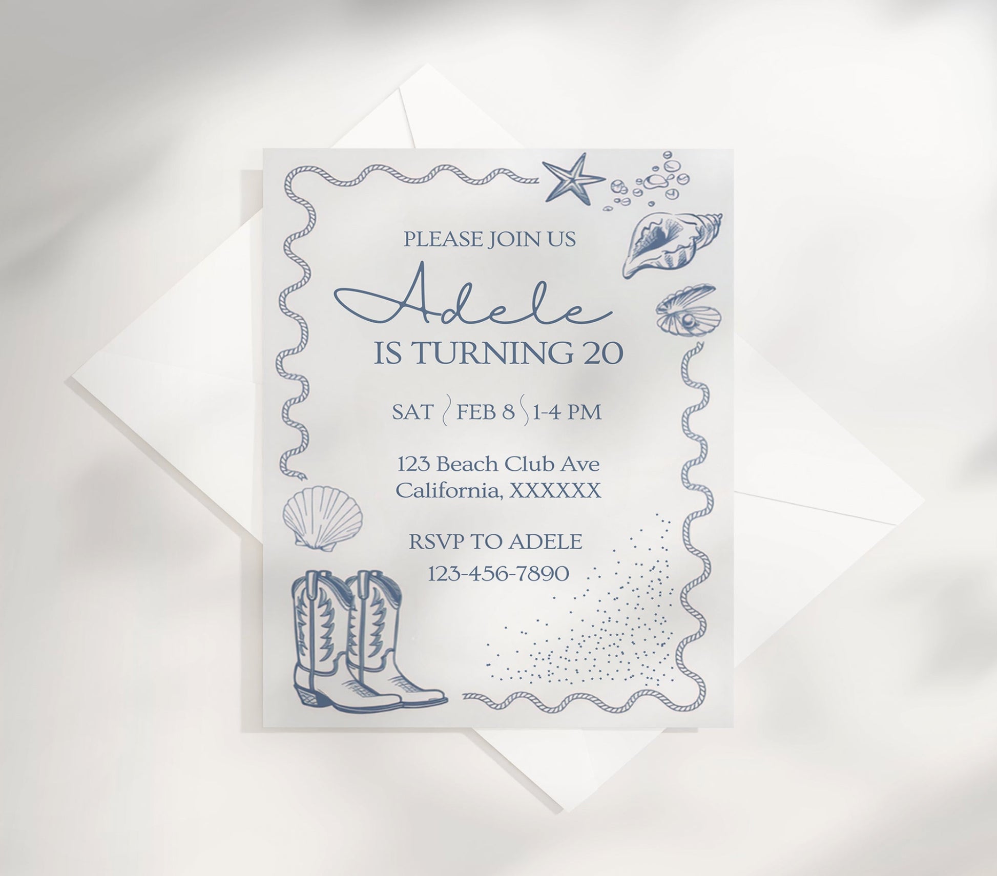 Celebrate your special day in style with our Coastal Cowgirl Birthday Invitation, where trendy blue hues meet a delightful beach cabana vibe! This eye-catching invitation captures the essence of a coastal cowgirl adventure, perfect for those sunny birthday celebrations at the beach club, where laughter and waves mix. Crafted with a genuine touch, our design offers a charming blend of cowgirl spirit and coastal flair, making it a standout choice for a memorable birthday bash.