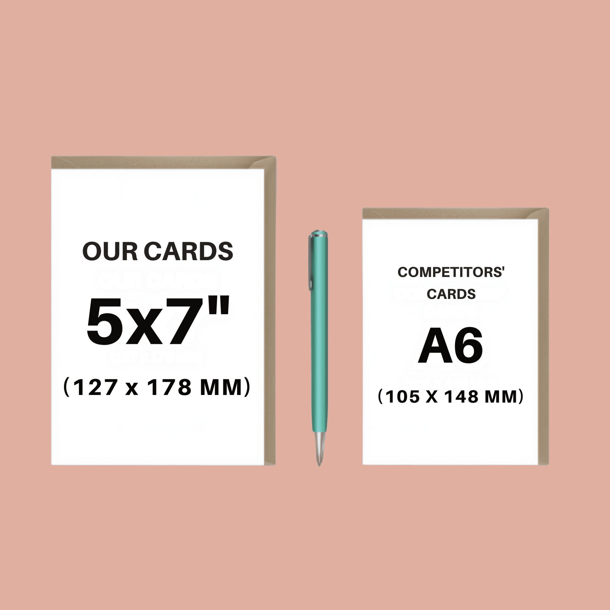 A folded 5" x 7" greeting card paired with a coordinating A7 envelope, printed on ultra-thick, luxurious 300 GSM cardstock and finished with rich, fade-resistant inks for lasting vibrancy and detail. Proudly made in Canada, with taxes included in the listed price. Each card is carefully packaged in a rigid mailer to ensure it arrives in perfect condition.